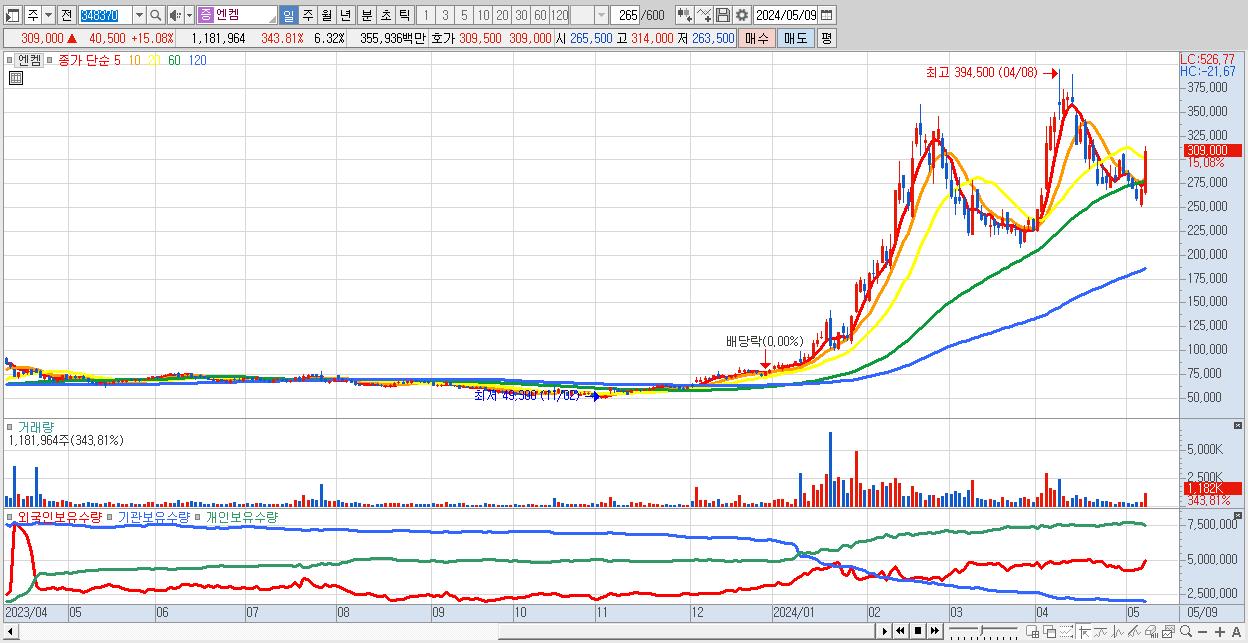 - 엔켐 (309,000원 ▲ 15.08% , 시총: 57,765억, 거래량: 1,181,964, 거래대금:3,559억)