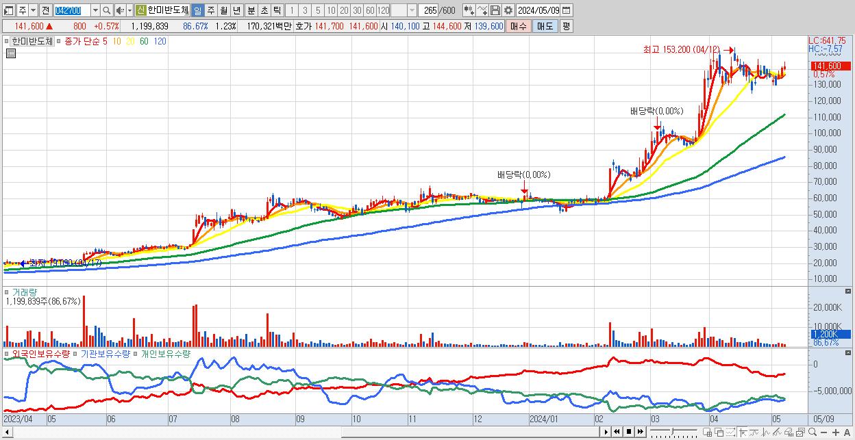 - 한미반도체 (141,600원 ▲ 0.57% , 시총: 137,832억, 거래량: 1,199,839, 거래대금:1,703억)