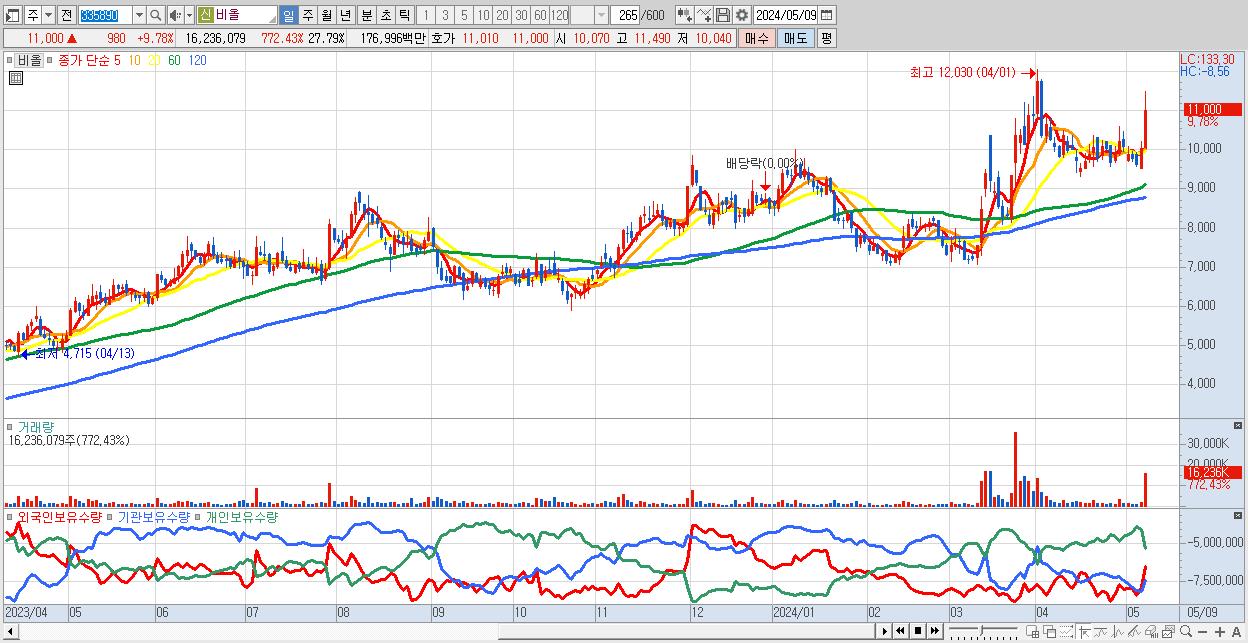 - 비올 (11,000원 ▲ 9.78% , 시총: 6,426억, 거래량: 16,236,079, 거래대금:1,770억)