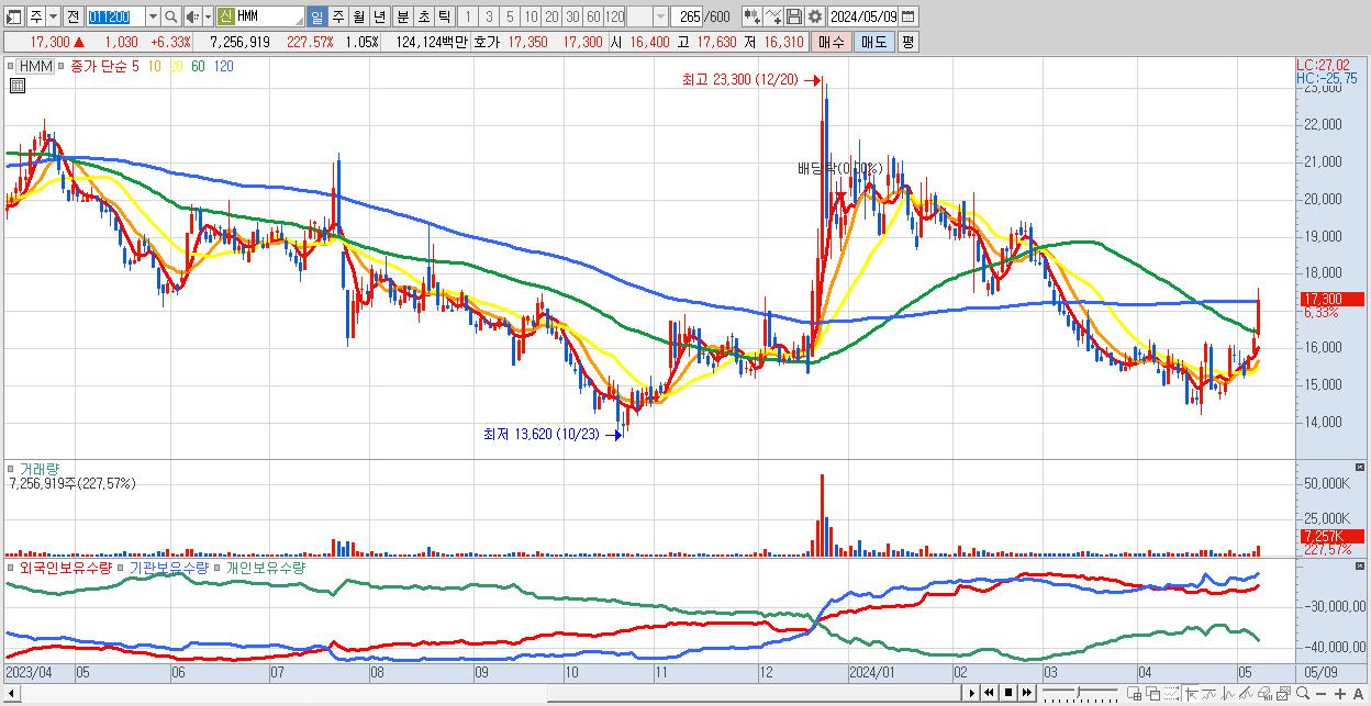 - HMM (17,300원 ▲ 6.33% , 시총: 119,204억, 거래량: 7,256,919, 거래대금:1,241억)