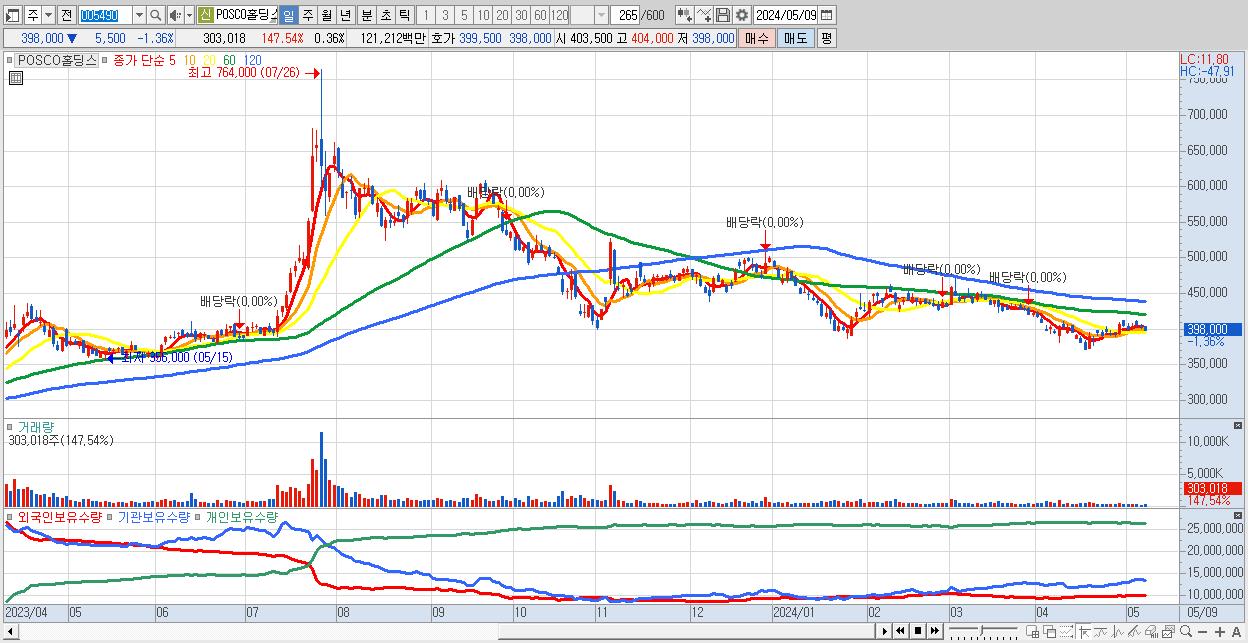 - POSCO홀딩스 (398,000원 ▼ -1.36% , 시총: 336,593억, 거래량: 303,018, 거래대금:1,212억)