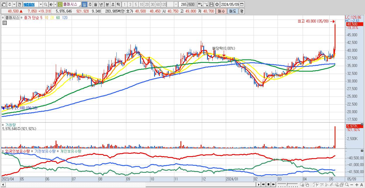 - 클래시스 (48,500원 ▲ 19.31% , 시총: 31,040억, 거래량: 5,976,646, 거래대금:2,840억)
