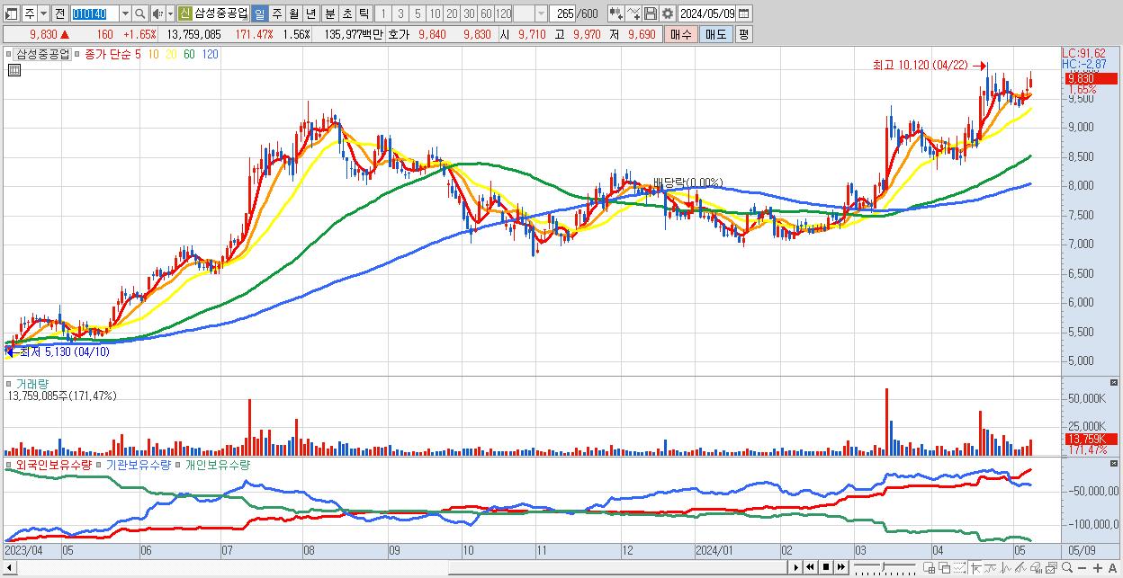- 삼성중공업 (9,830원 ▲ 1.65% , 시총: 86,504억, 거래량: 13,759,085, 거래대금:1,360억)