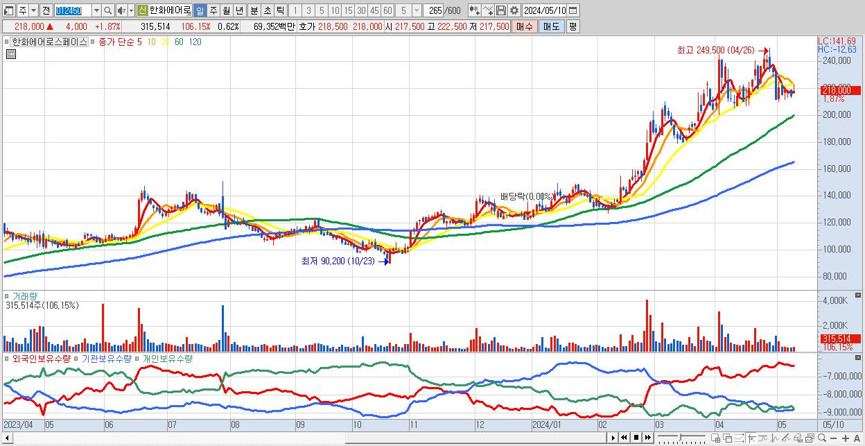 - 한화에어로스페이스 (218,000원 ▲ 1.87% , 시총: 110,373억, 외국인 순매수 거래금:138억)