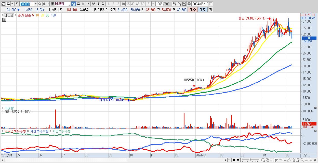 - 테크윙 (31,000원 ▼ -5.92% , 시총: 11,580억, 외국인 순매수 거래금:61억)