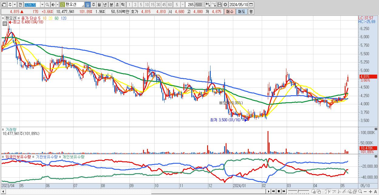- 팬오션 (4,815원 ▲ 3.66% , 시총: 25,740억, 외국인 순매수 거래금:104억)