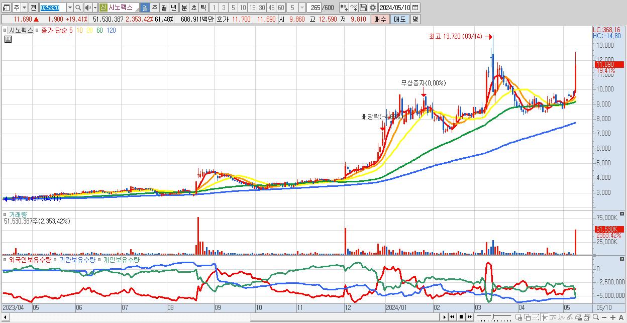 - 시노펙스 (11,690원 ▲ 19.41% , 시총: 9,798억, 외국인 순매수 거래금:295억)