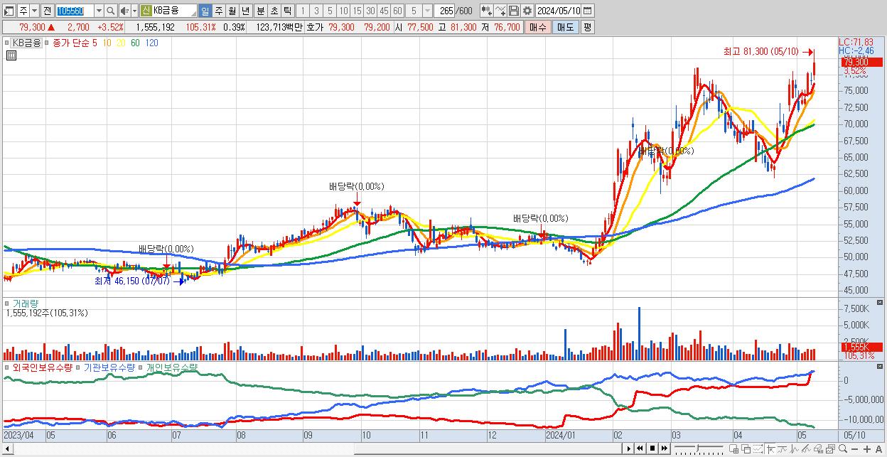 - KB금융 (79,300원 ▲ 3.52% , 시총: 319,984억, 외국인 순매수 거래금:210억)