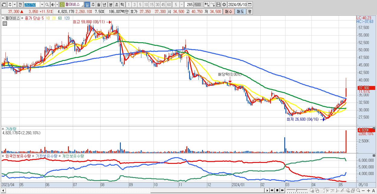 - 펄어비스 (37,300원 ▲ 11.51% , 시총: 23,964억, 외국인 순매수 거래금:70억)