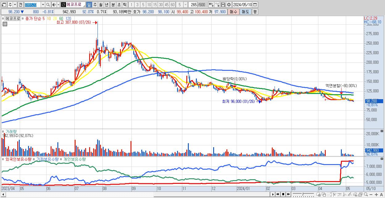 - 에코프로 (98,200원 ▼ -0.81% , 시총: 130,742억, 외국인 순매수 거래금:64억)