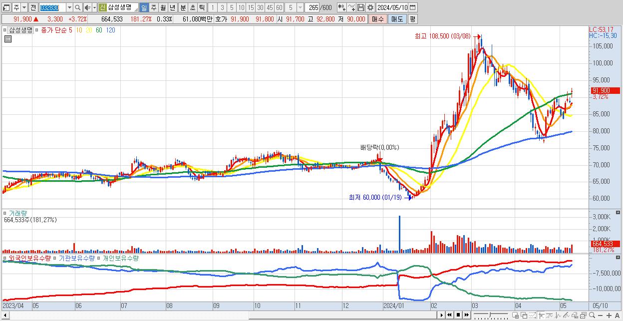 - 삼성생명 (91,900원 ▲ 3.72% , 시총: 183,800억, 외국인 순매수 거래금:184억)