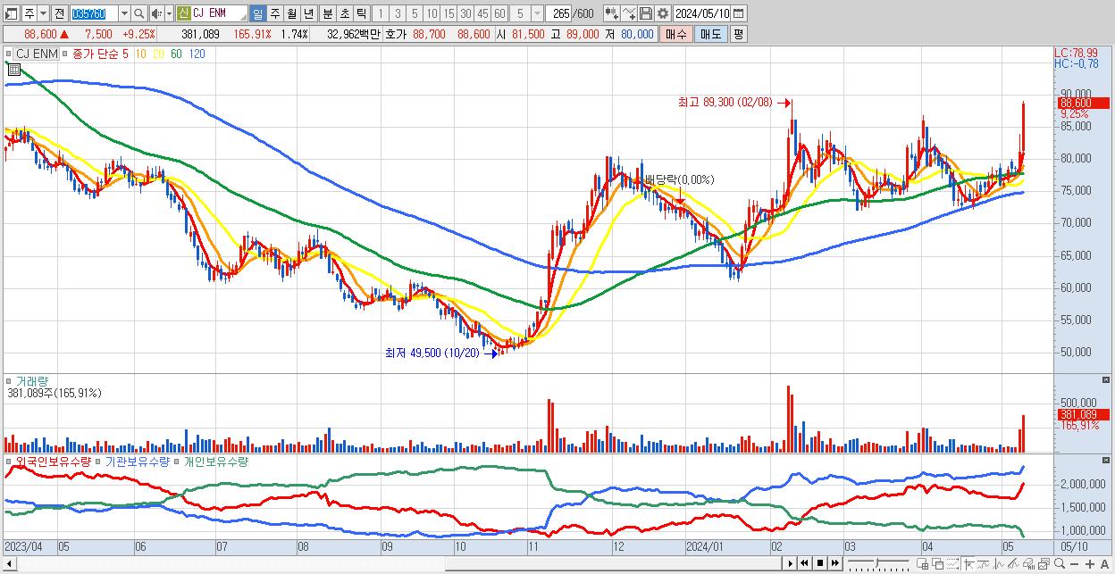 - CJ ENM (88,600원 ▲ 9.25% , 시총: 19,429억, 외국인 순매수 거래금:56억)