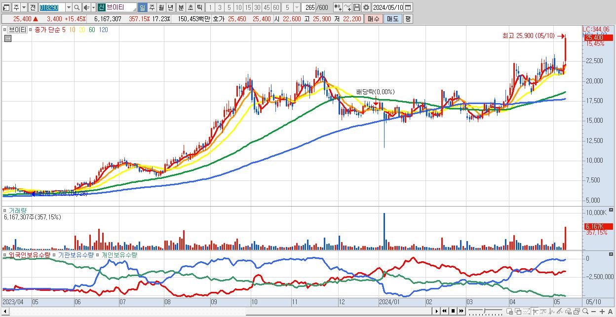 - 브이티 (25,400원 ▲ 15.45% , 시총: 9,093억, 거래량: 6,167,307, 거래대금:1,505억, KOSDAQ)