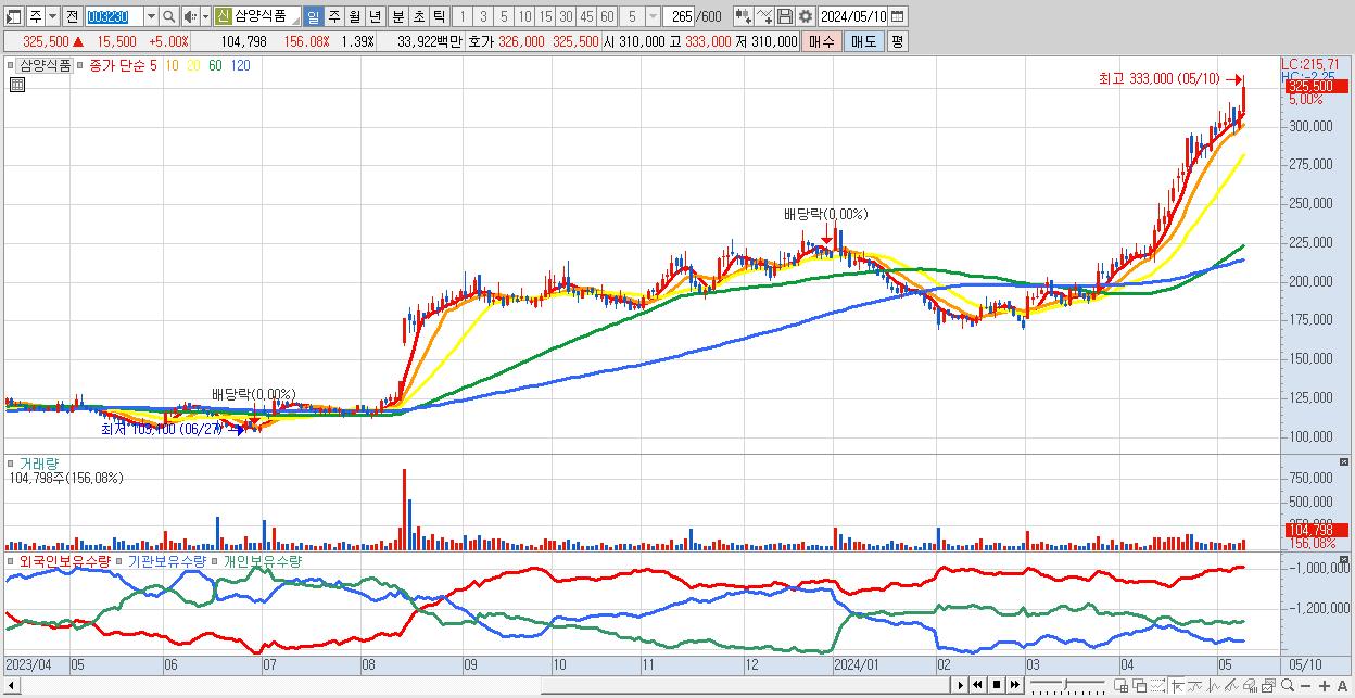 - 삼양식품 (325,500원 ▲ 5% , 시총: 24,520억, 거래량: 104,798, 거래대금:339억, KOSPI)