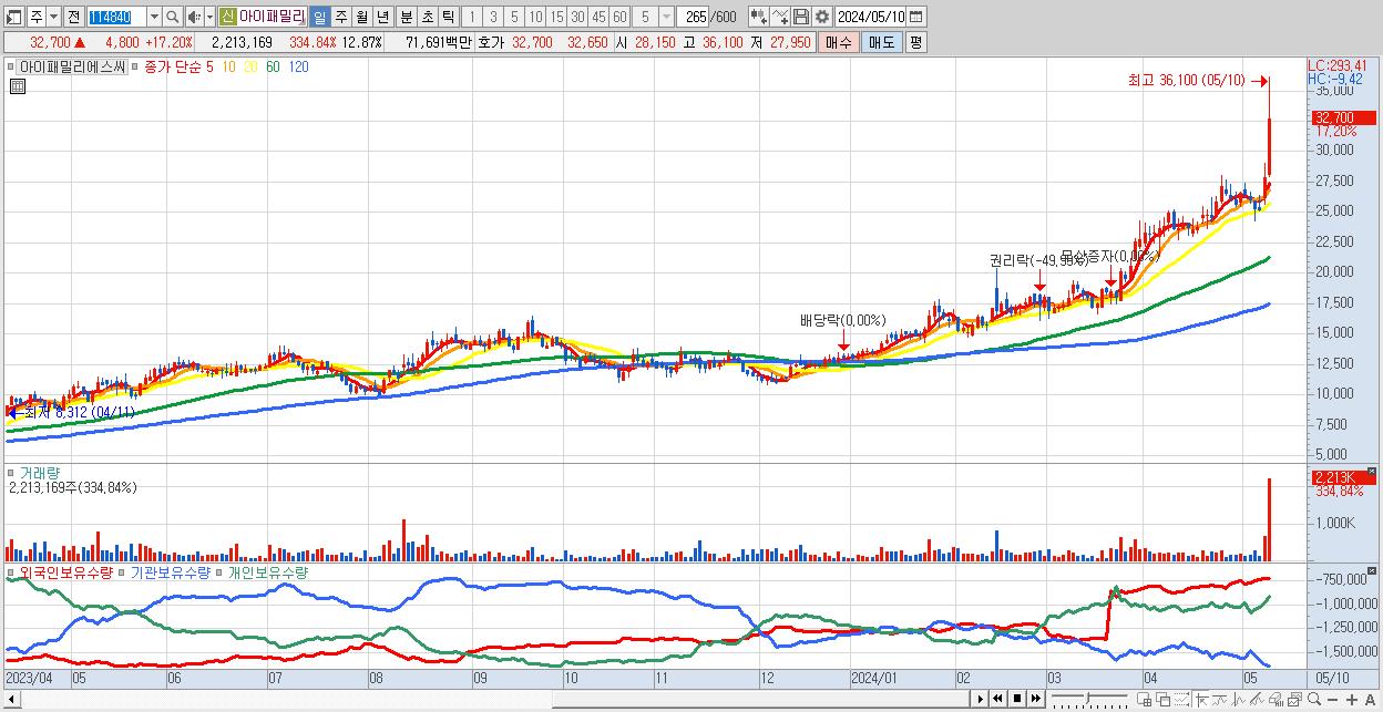- 아이패밀리에스씨 (32,700원 ▲ 17.2% , 시총: 5,625억, 거래량: 2,213,169, 거래대금:717억, KOSDAQ)