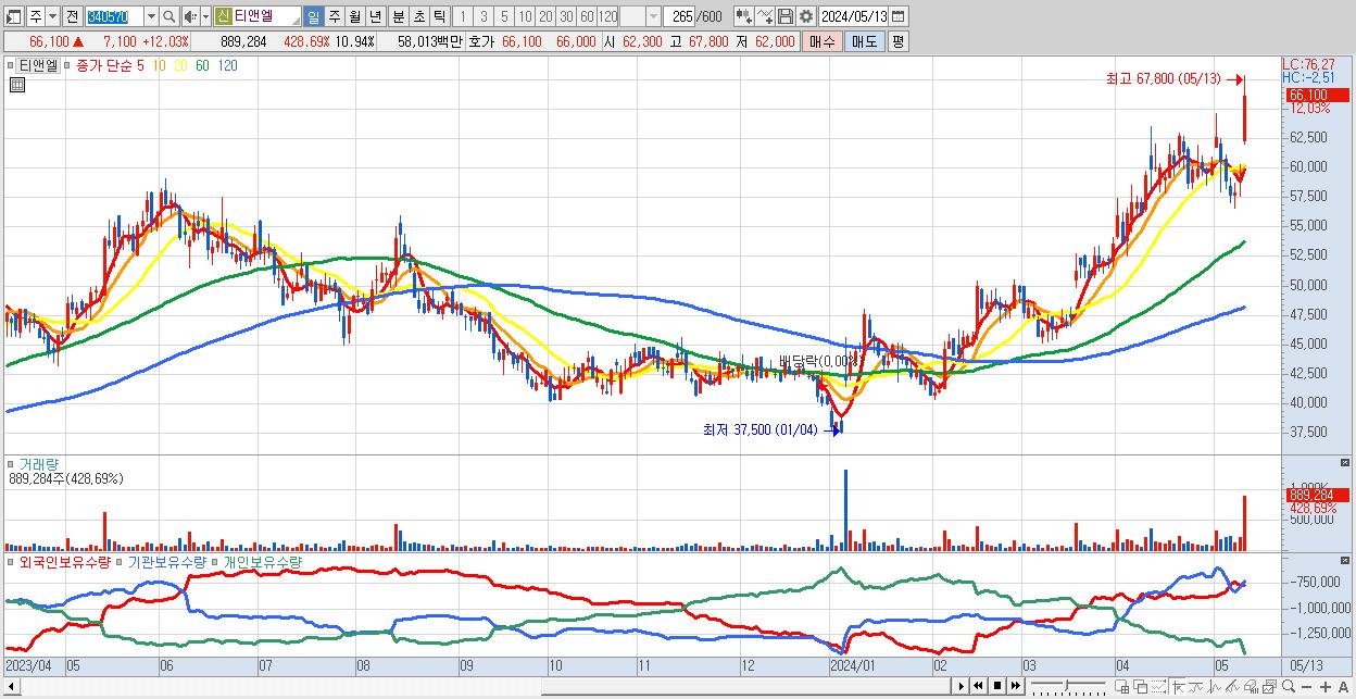 - 티앤엘 (66,100원 ▲ 12.03% , 시총: 5,373억, 거래량: 889,284, 거래대금:580억)