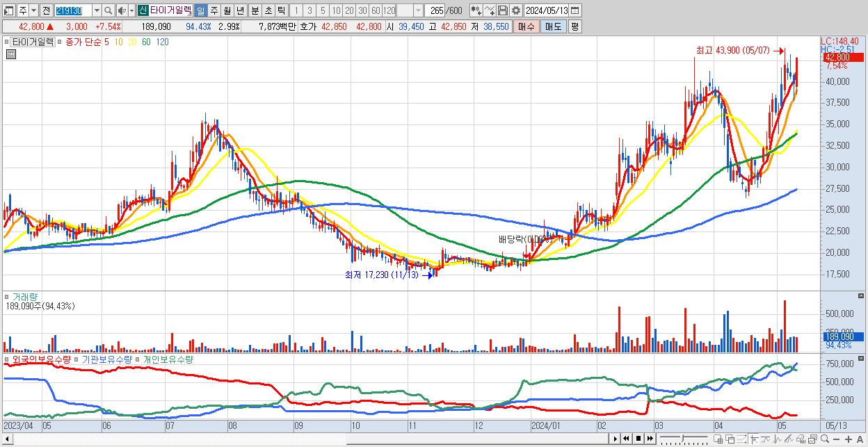 29.타이거일렉 42,800원 ▲ 7.54% (KOSDAQ, 219130)