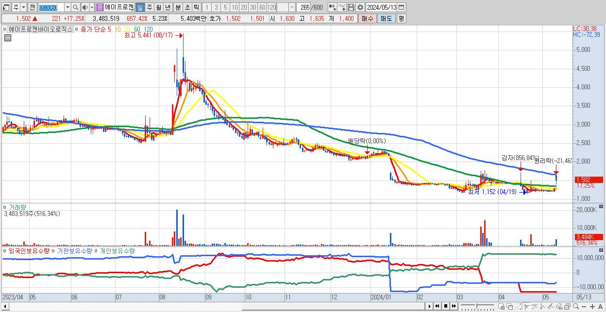 - 에이프로젠바이오로직스 (1,502원 ▲ 17.25% , 시총: 1,000억, 거래량: 3,483,519, 거래대금:54억)