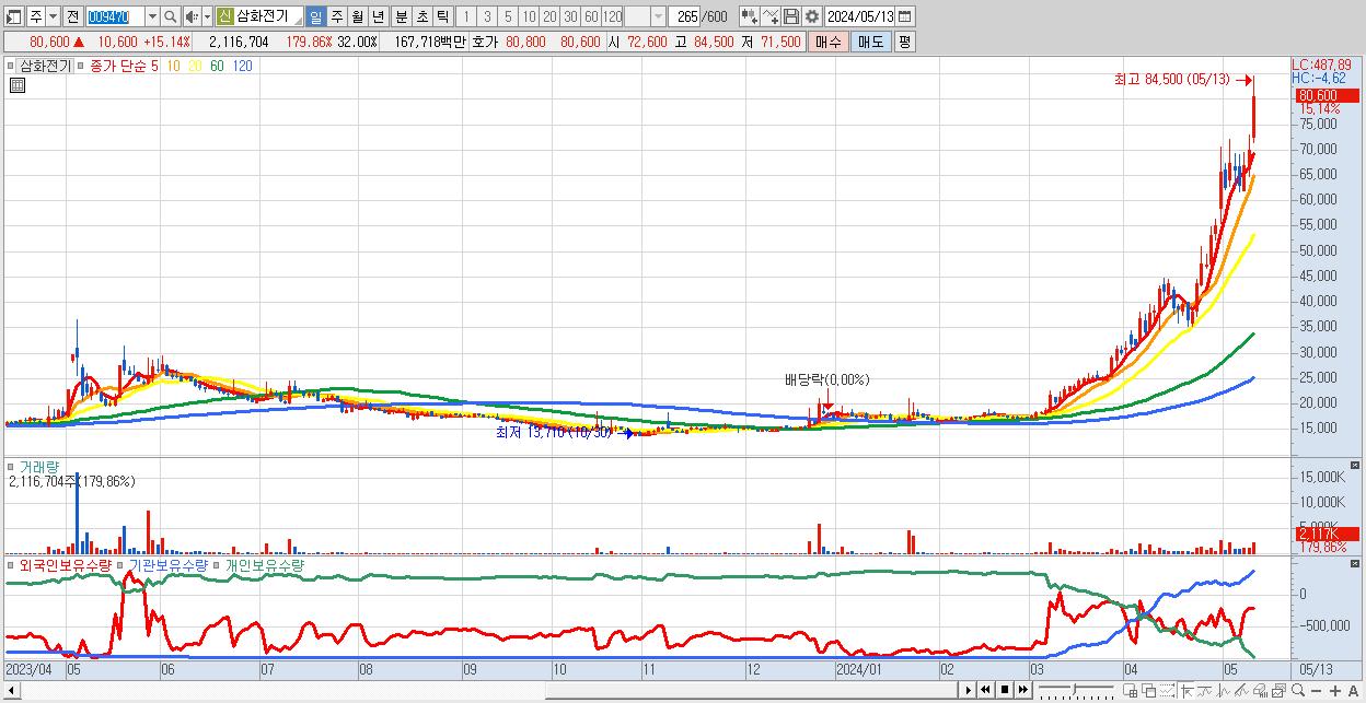 - 삼화전기 (80,600원 ▲ 15.14% , 시총: 5,331억, 거래량: 2,116,704, 거래대금:1,677억)