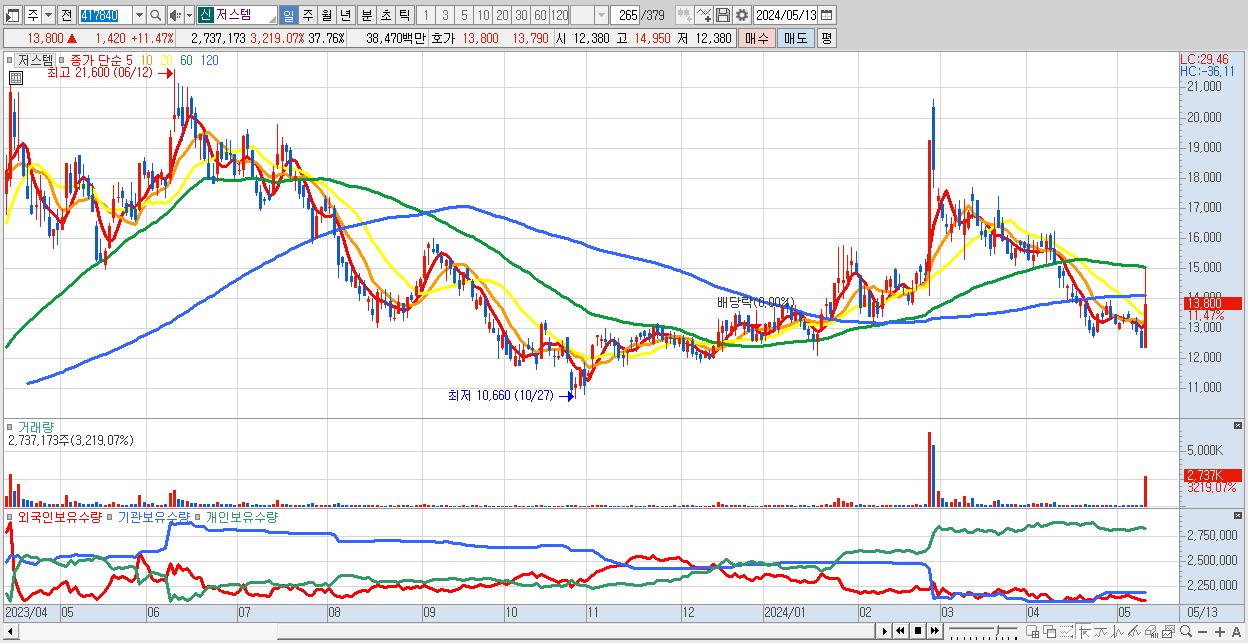 - 저스템 (13,800원 ▲ 11.47% , 시총: 1,000억, 거래량: 2,737,173, 거래대금:385억)