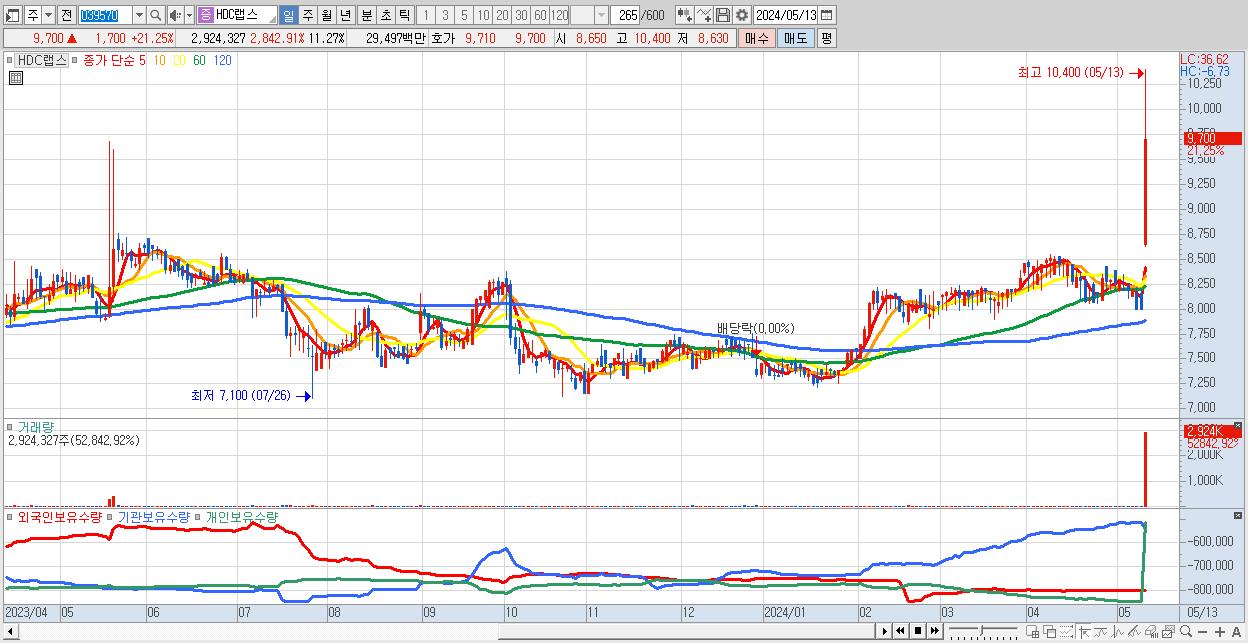 - HDC랩스 (9,700원 ▲ 21.25% , 시총: 2,518억, 거래량: 2,924,327, 거래대금:295억)