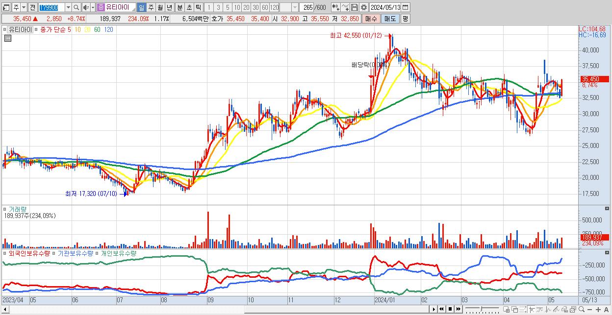 - 유티아이 (35,450원 ▲ 8.74% , 시총: 5,774억, 거래량: 189,937, 거래대금:65억)