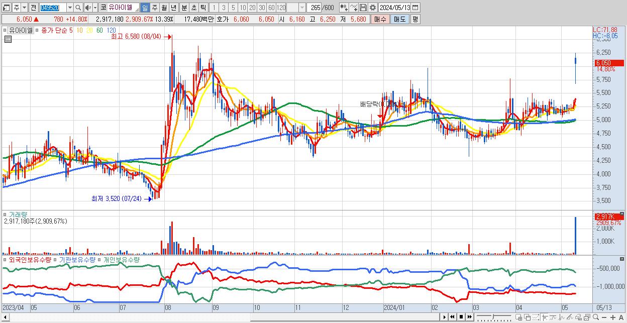 - 유아이엘 (6,050원 ▲ 14.8% , 시총: 1,318억, 거래량: 2,917,180, 거래대금:175억)