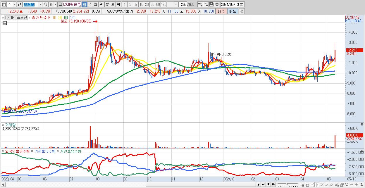 - LS마린솔루션 (12,240원 ▲ 9.29% , 시총: 3,175억, 거래량: 4,838,048, 거래대금:599억)