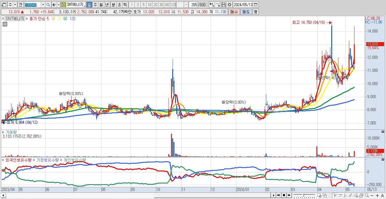 - SNT에너지 (13,010원 ▲ 15.64% , 시총: 977억, 거래량: 3,133,115, 거래대금:422억)