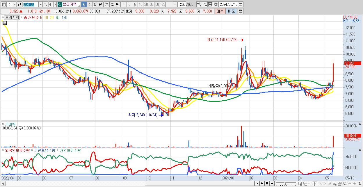 - 브리지텍 (9,320원 ▲ 24.1% , 시총: 1,114억, 거래량: 10,863,241, 거래대금:972억)