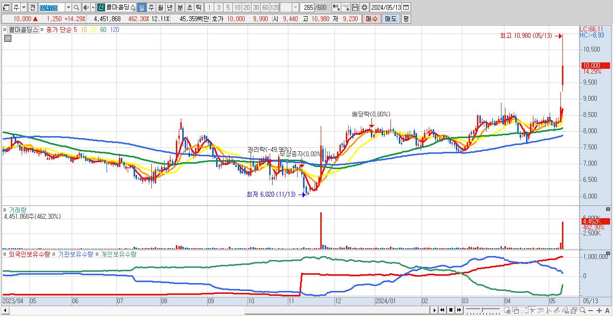 - 콜마홀딩스 (10,000원 ▲ 14.29% , 시총: 3,677억, 거래량: 4,451,868, 거래대금:454억)
