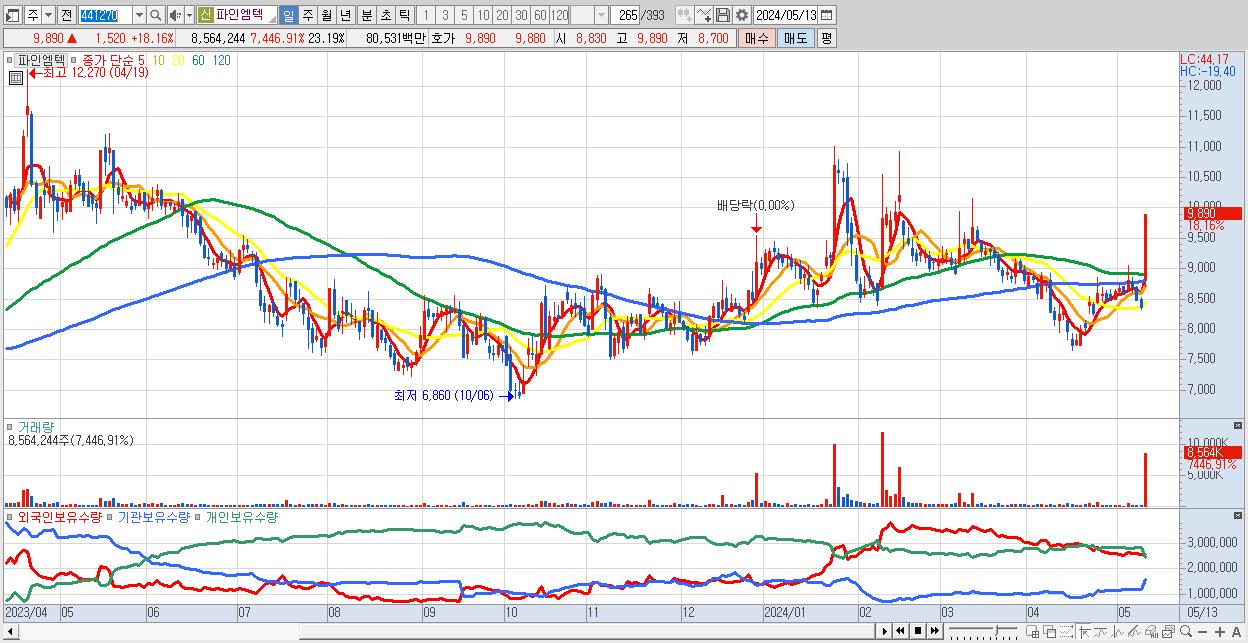 - 파인엠텍 (9,890원 ▲ 18.16% , 시총: 3,652억, 거래량: 8,564,244, 거래대금:805억)