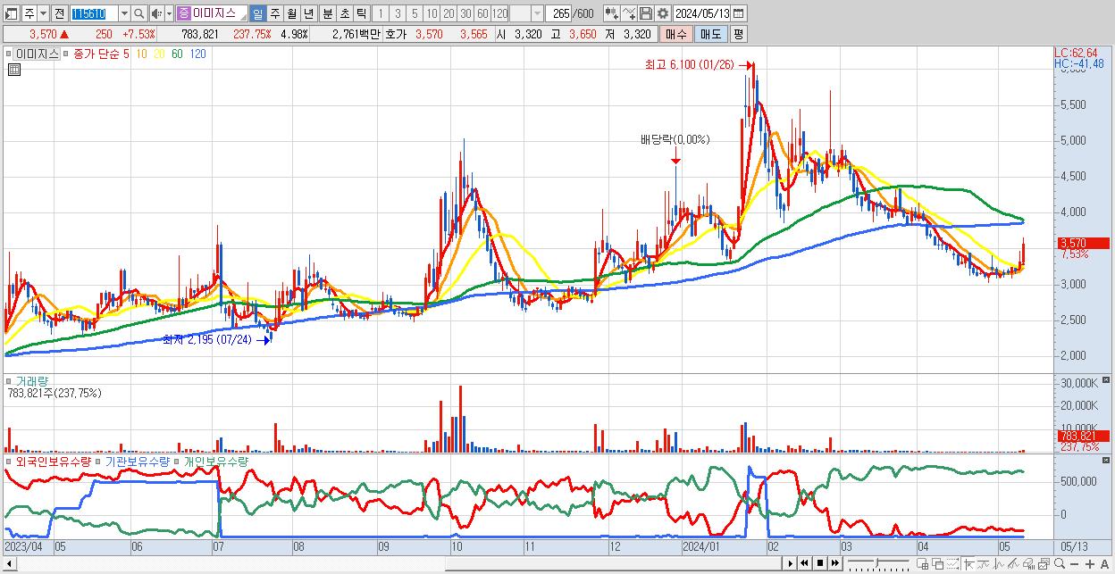 - 이미지스 (3,570원 ▲ 7.53% , 시총: 562억, 거래량: 783,821, 거래대금:28억)