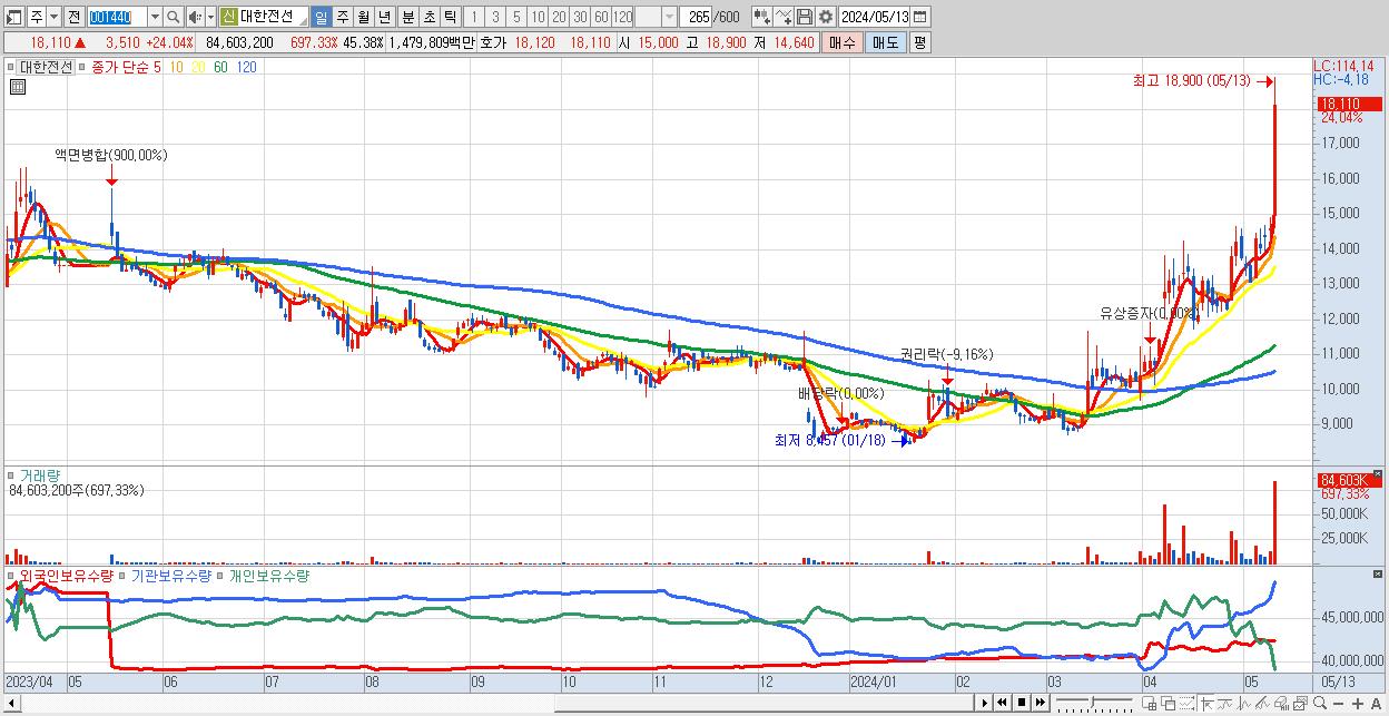 - 대한전선 (18,110원 ▲ 24.04% , 시총: 33,766억, 거래량: 84,603,200, 거래대금:14,798억)