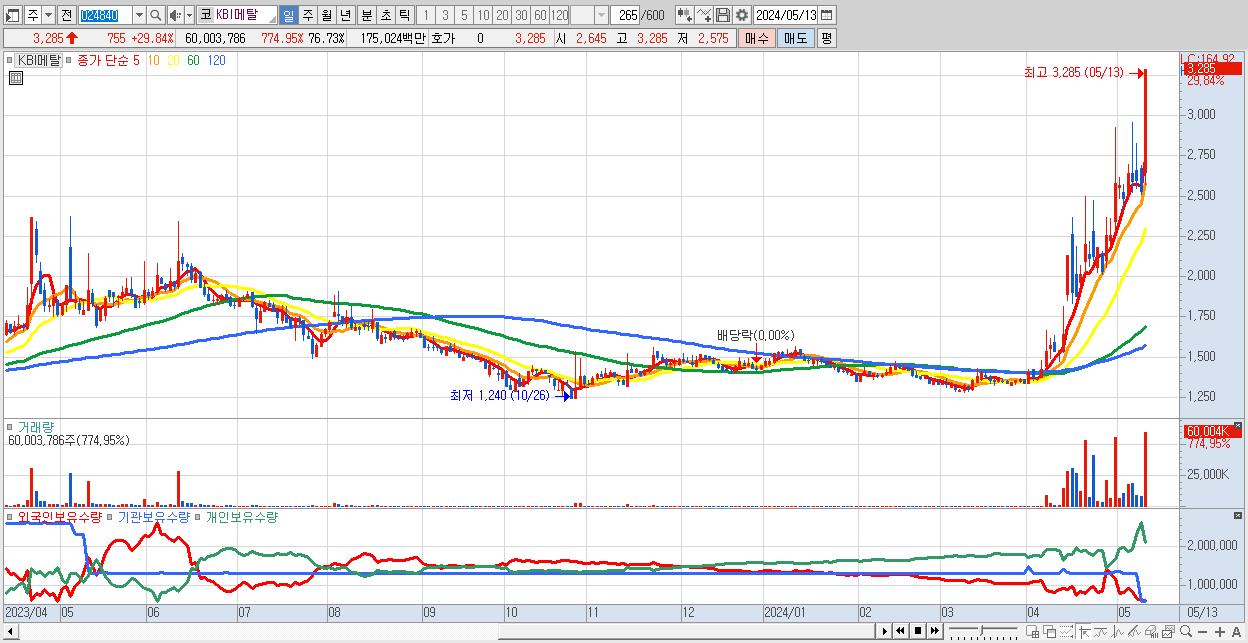 - KBI메탈 (3,285원 ▲ 29.84% , 시총: 1,115억, 거래량: 60,003,786, 거래대금:1,750억)