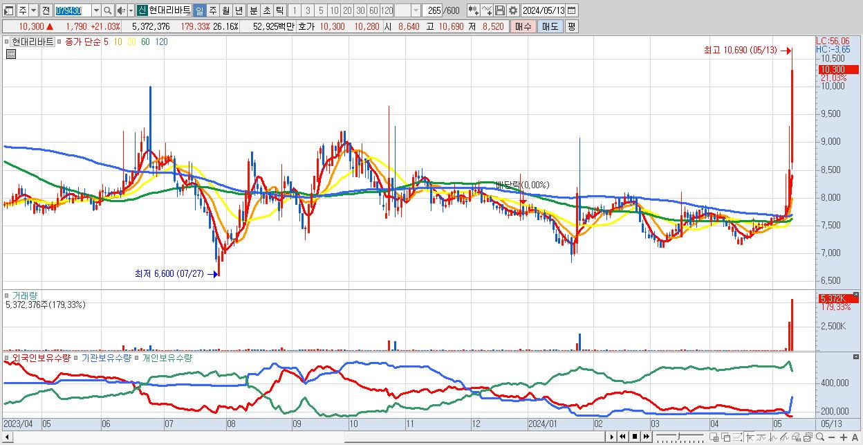 - 현대리바트 (10,300원 ▲ 21.03% , 시총: 2,115억, 거래량: 5,372,376, 거래대금:529억)