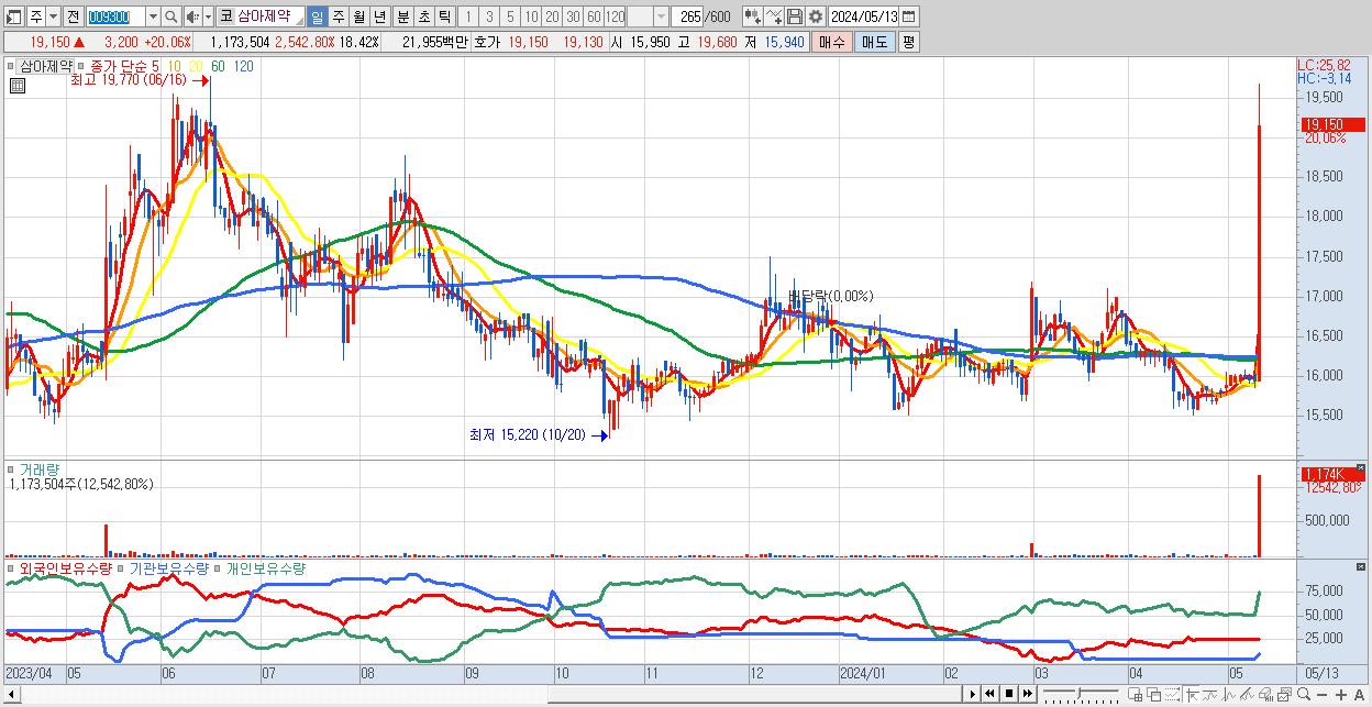 - 삼아제약 (19,150원 ▲ 20.06% , 시총: 1,220억, 거래량: 1,173,504, 거래대금:220억)