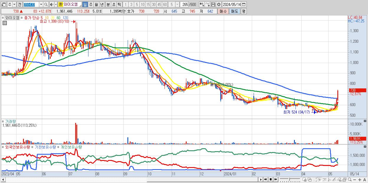 - 와이오엠 (738원 ▲ 12.67% , 시총: 289억, 거래량: 1,961,446, 거래대금:14억)