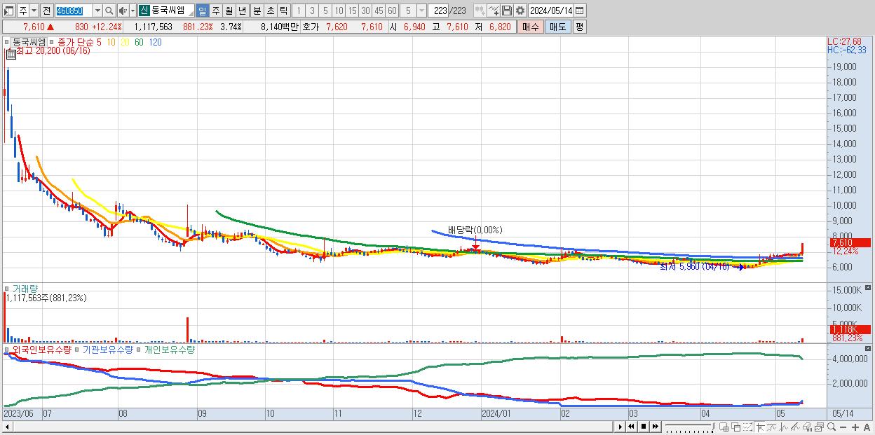 - 동국씨엠 (7,610원 ▲ 12.24% , 시총: 2,275억, 거래량: 1,117,563, 거래대금:81억)