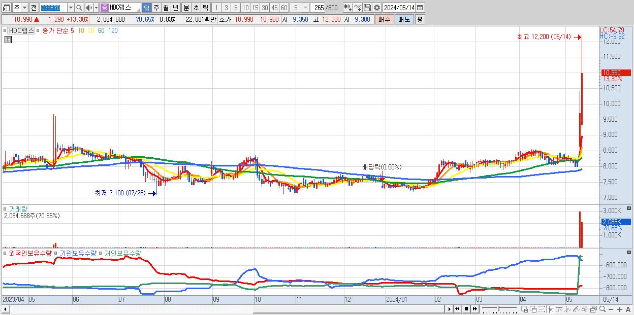 - HDC랩스 (10,990원 ▲ 13.3% , 시총: 2,853억, 거래량: 2,084,688, 거래대금:228억)