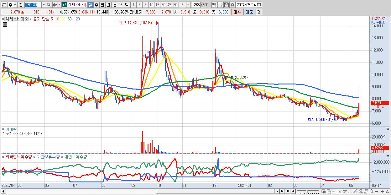 - 엑세스바이오 (7,670원 ▲ 11.81% , 시총: 2,789억, 거래량: 4,524,659, 거래대금:367억)