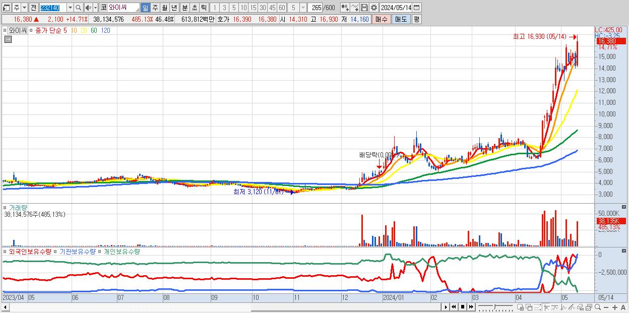 - 와이씨 (16,380원 ▲ 14.71% , 시총: 13,439억, 거래량: 38,134,576, 거래대금:6,138억)