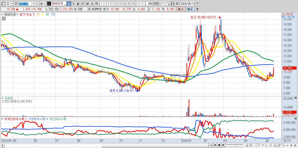 - 포바이포 (10,780원 ▲ 15.79% , 시총: 1,194억, 거래량: 2,723,153, 거래대금:289억)