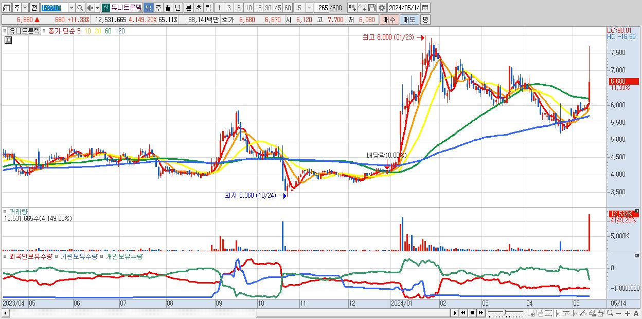 - 유니트론텍 (6,680원 ▲ 11.33% , 시총: 1,286억, 거래량: 12,531,665, 거래대금:881억)