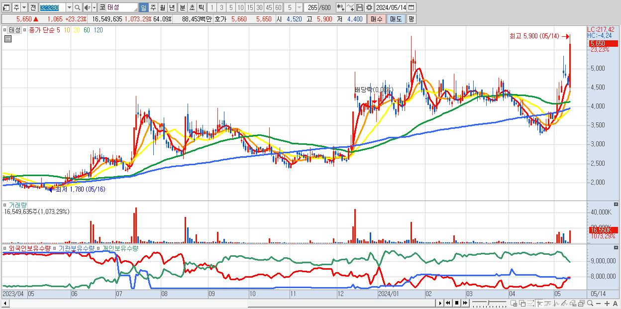 - 태성 (5,650원 ▲ 23.23% , 시총: 1,459억, 거래량: 16,549,635, 거래대금:885억)