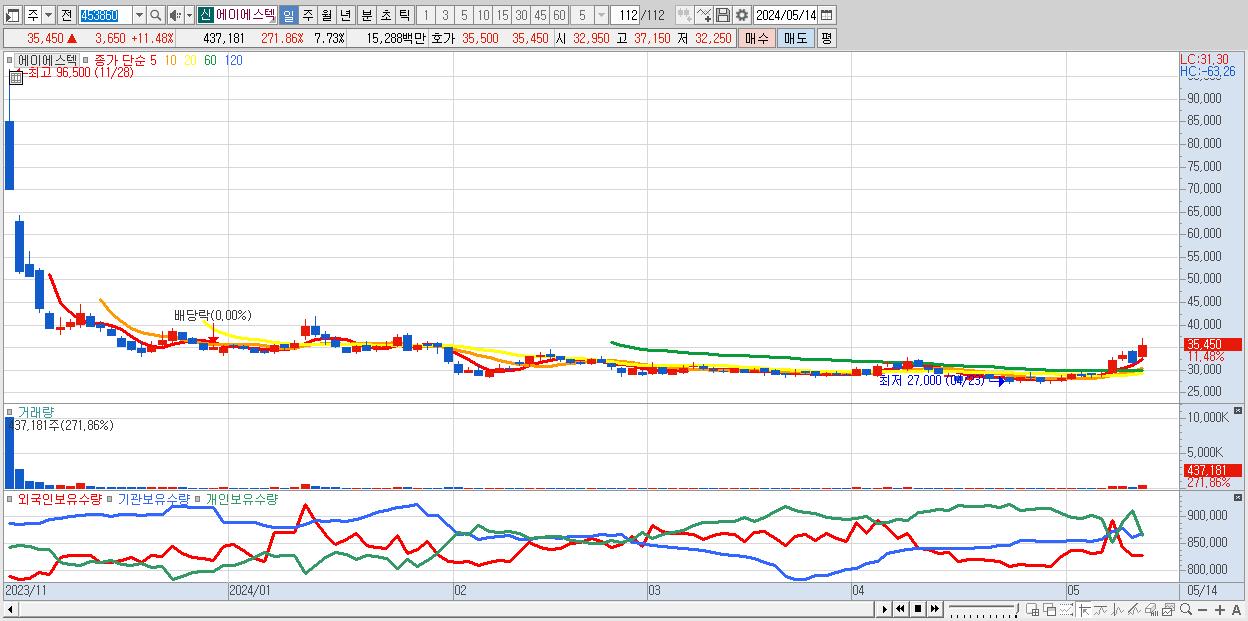 - 에이에스텍 (35,450원 ▲ 11.48% , 시총: 2,005억, 거래량: 437,181, 거래대금:153억)
