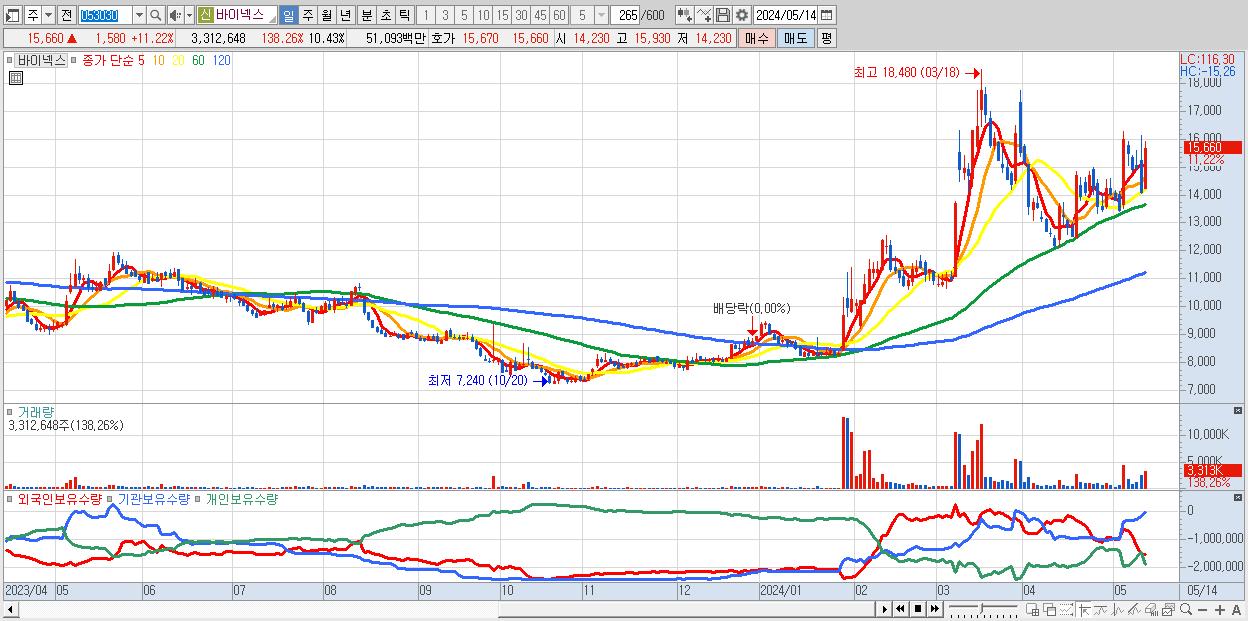 - 바이넥스 (15,660원 ▲ 11.22% , 시총: 4,974억, 거래량: 3,312,648, 거래대금:511억)