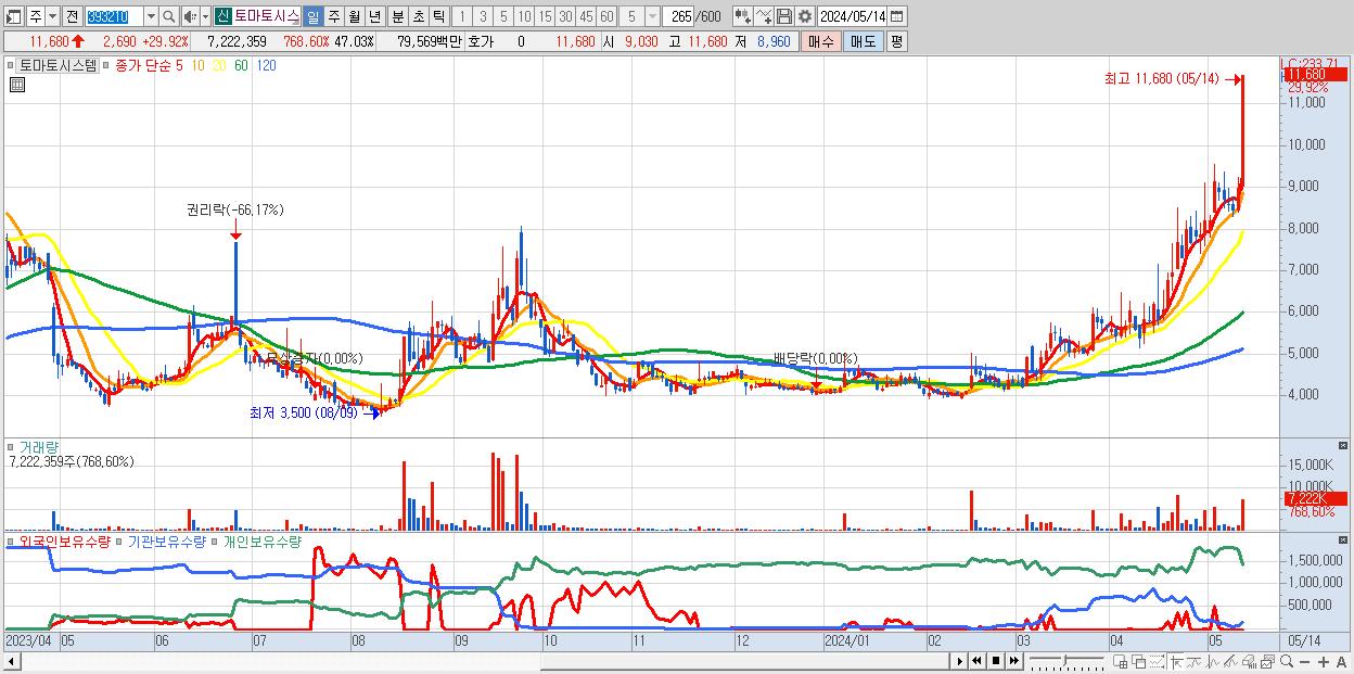 - 토마토시스템 (11,680원 ▲ 29.92% , 시총: 1,794억, 거래량: 7,222,359, 거래대금:796억)