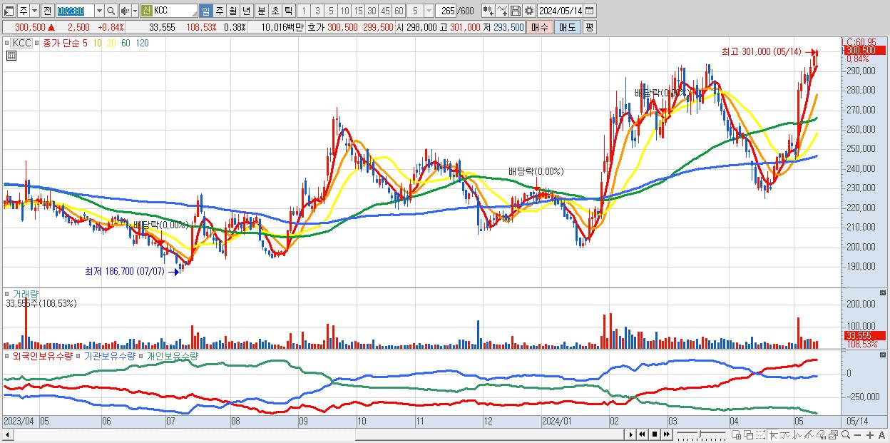 - KCC (300,500원 ▲ 0.84% , 시총: 26,704억, 거래량: 33,555, 거래대금:100억, KOSPI)
