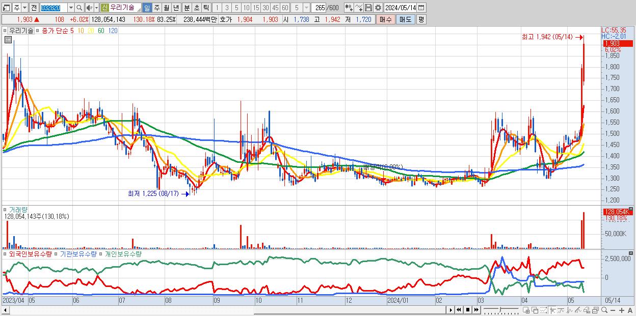 - 우리기술 (1,903원 ▲ 6.02% , 시총: 2,927억, 거래량: 128,054,143, 거래대금:2,384억, KOSDAQ)